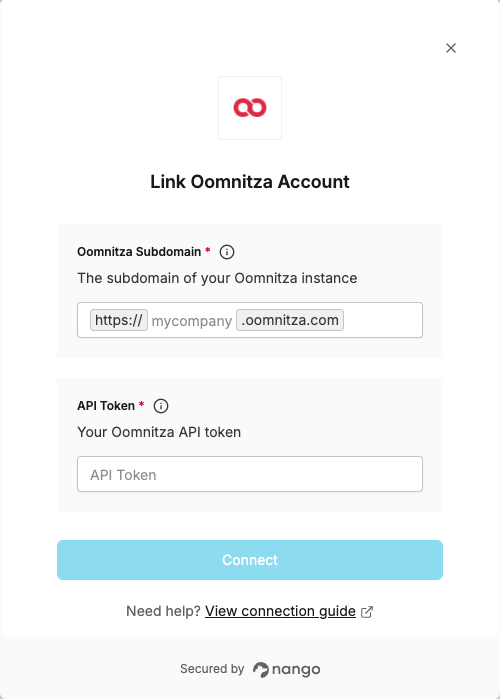 2. API Token - A key that grants Nango permission to interact with Oomnitza’s API resources and services.