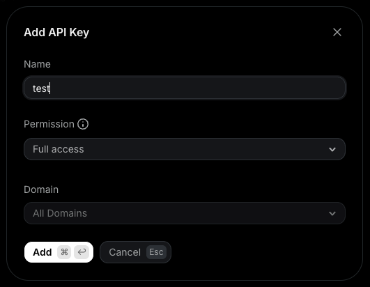 - Enter a name, select the permissions and domain the key has access to, then click Add to submit the form.