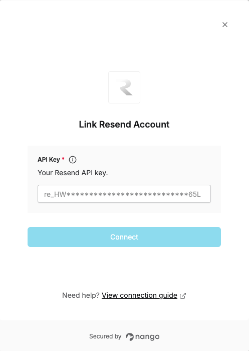 To authenticate with Resend, you will need:- API Key – A key that grants secure access to the Resend API, enabling authorized applications to send email and manage Resend resources.