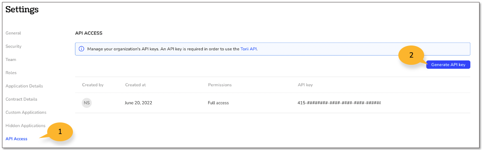 1. Navigate to the API Access page in your Torii account.