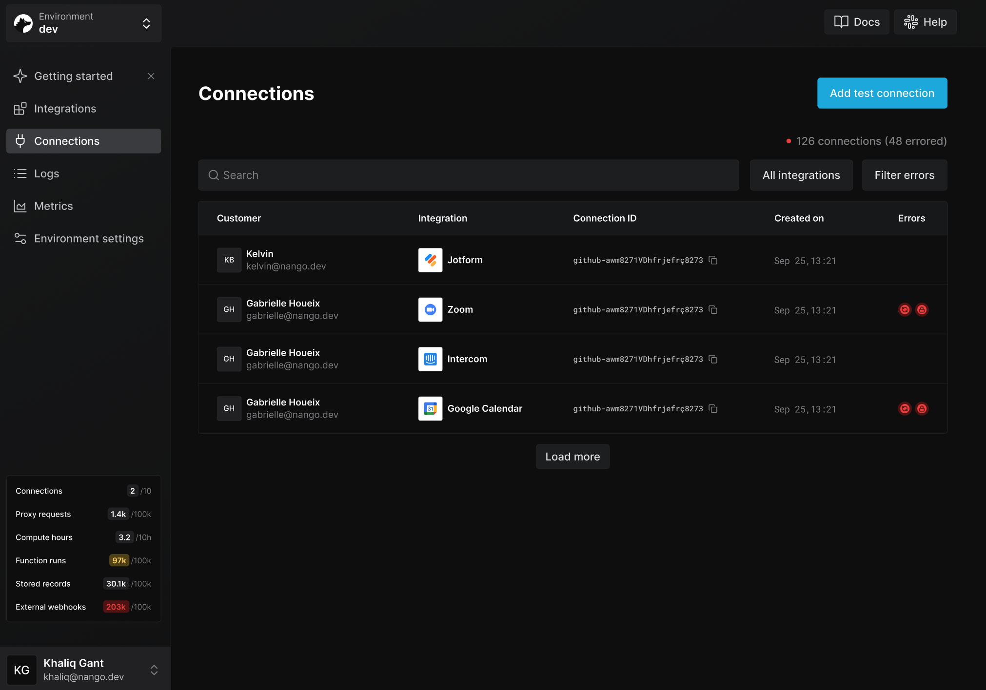 • end_user_email — shown alongside end_user_display_name in the connections list. The domain from the email address is also used to display the end user’s company logo on the connection detail page.