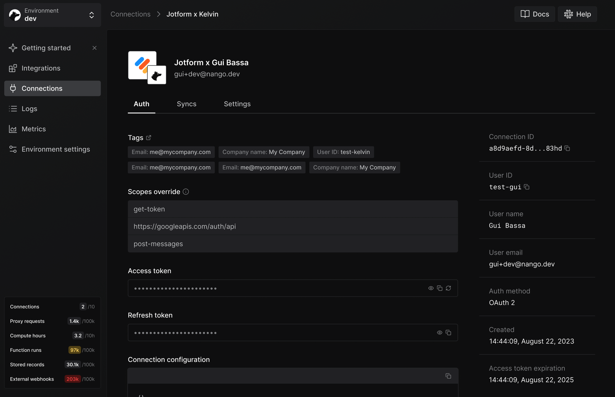 Nango also stores these tags on the connection itself.