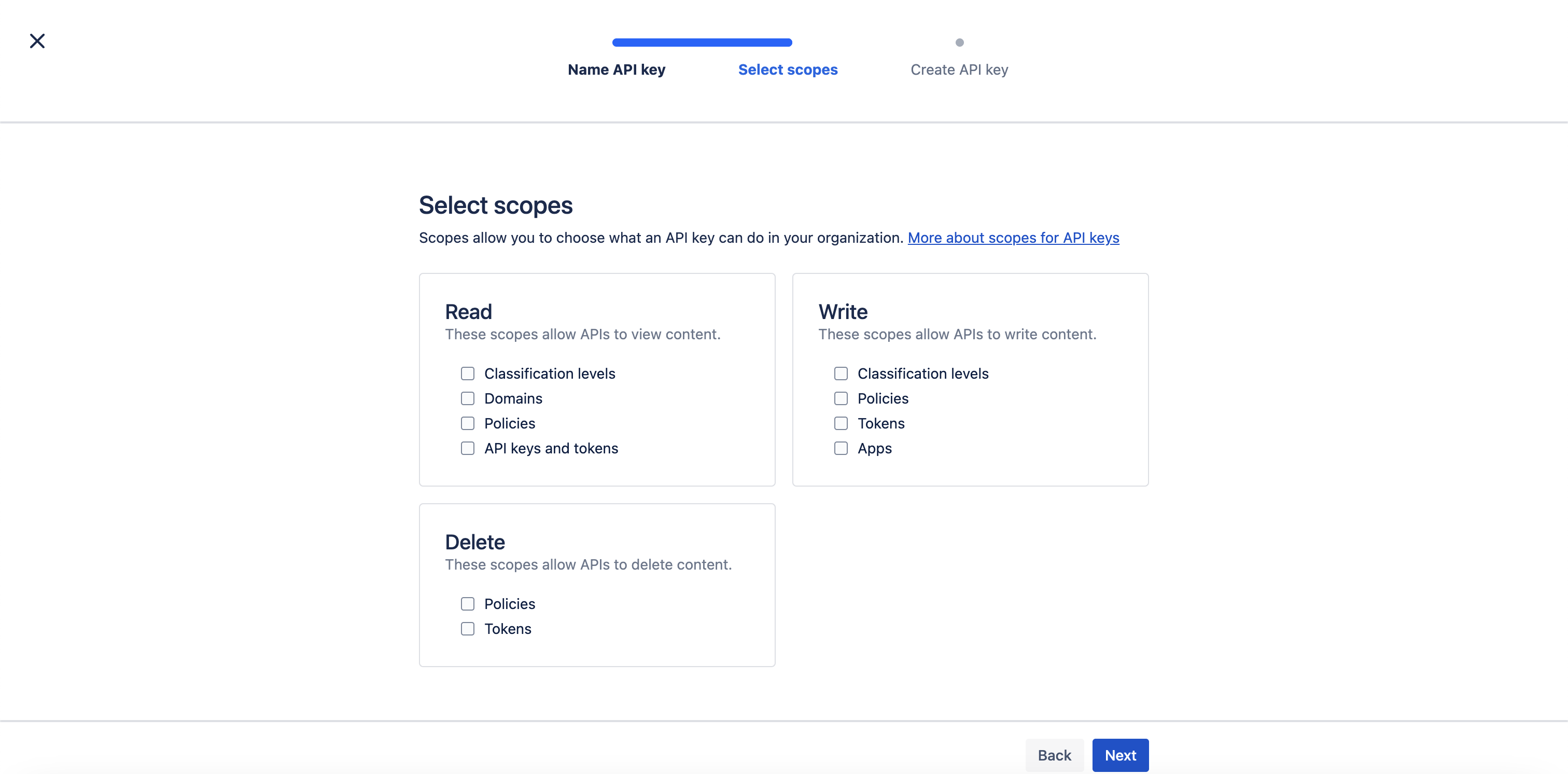 - (For scoped keys only) Under Select scopes, choose the appropriate permissions for your use case.