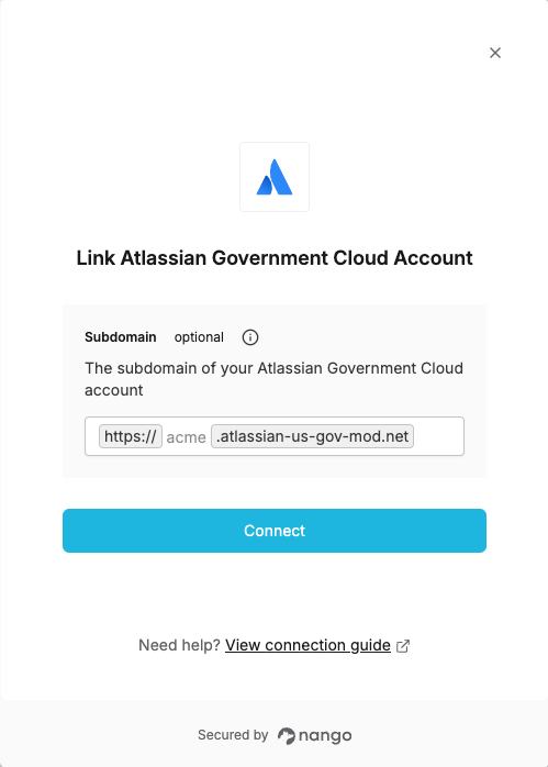 The Subdomain is optional. If not provided, Nango will automatically select the first available site from your accessible resources. However, if you have access to multiple sites, it’s recommended to specify the subdomain to ensure you connect to the correct one.