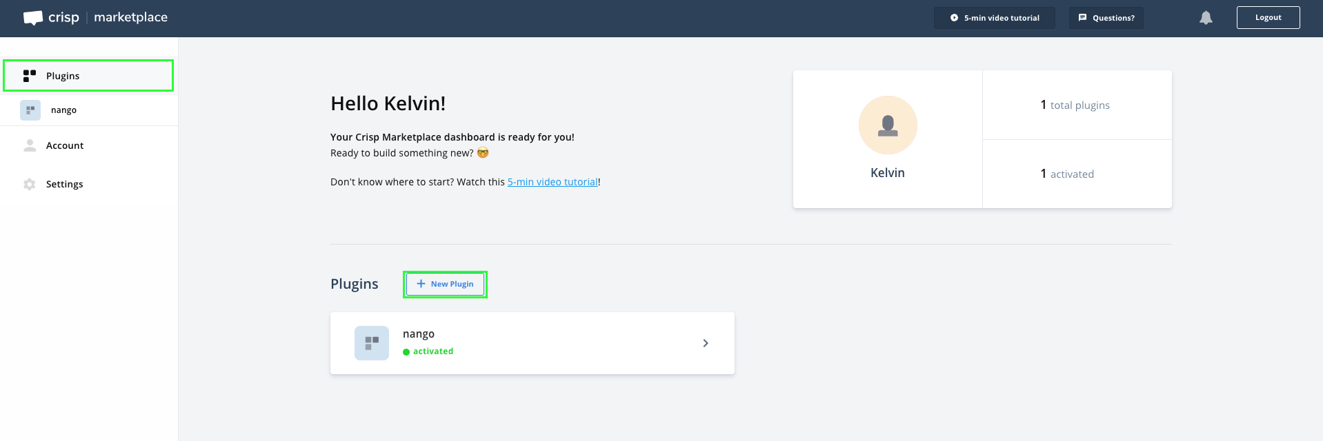 2. Once logged in, go to Plugins and click on the New Plugin button.