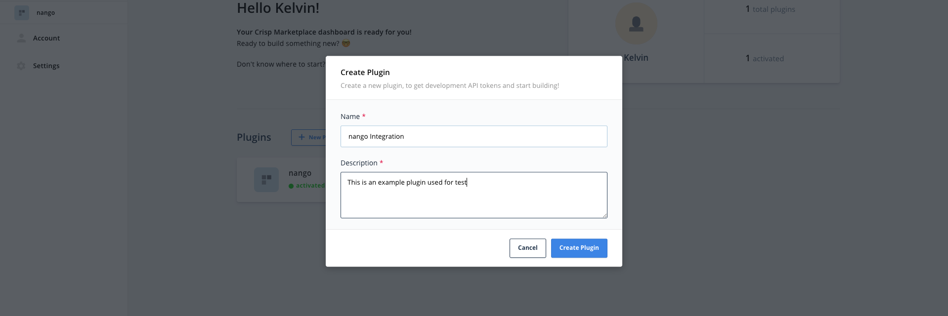 1. Give your plugin a name and description, then click Create Plugin.