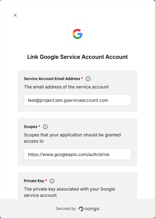 - Private Key – The private key generated when creating a service account key.