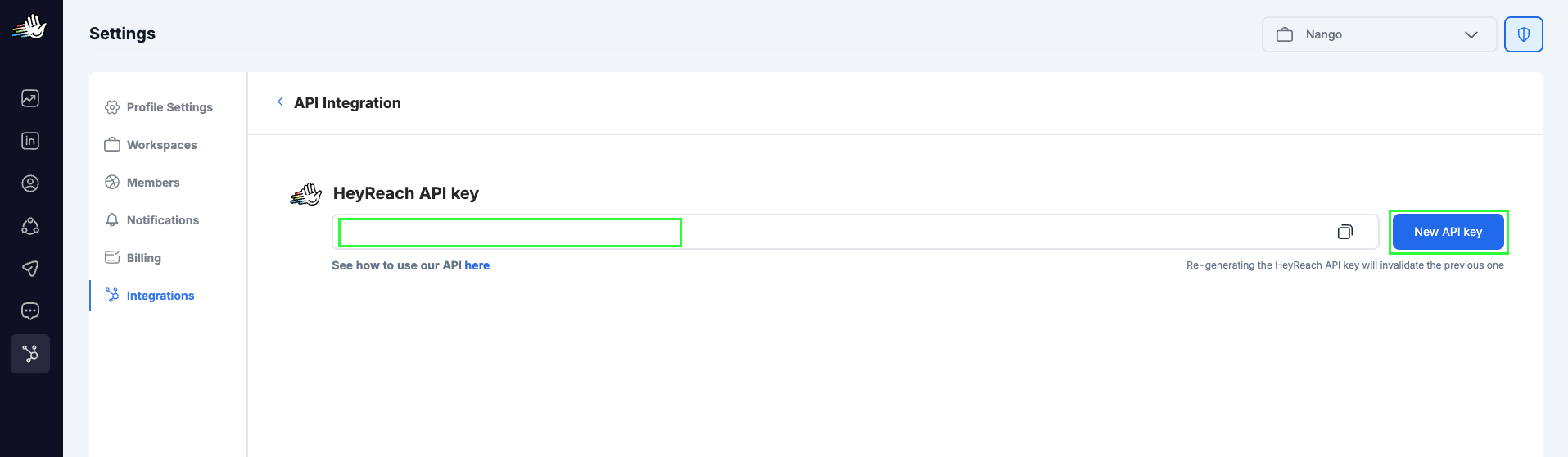 - Log in to your HeyReach account and navigate to API Integration.
