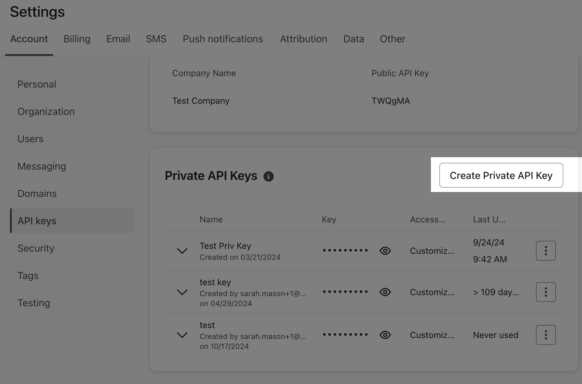 Important: For your account’s security, your private API keys should never be used with Client endpoints, exposed in client-side code, or made accessible from public repositories.
