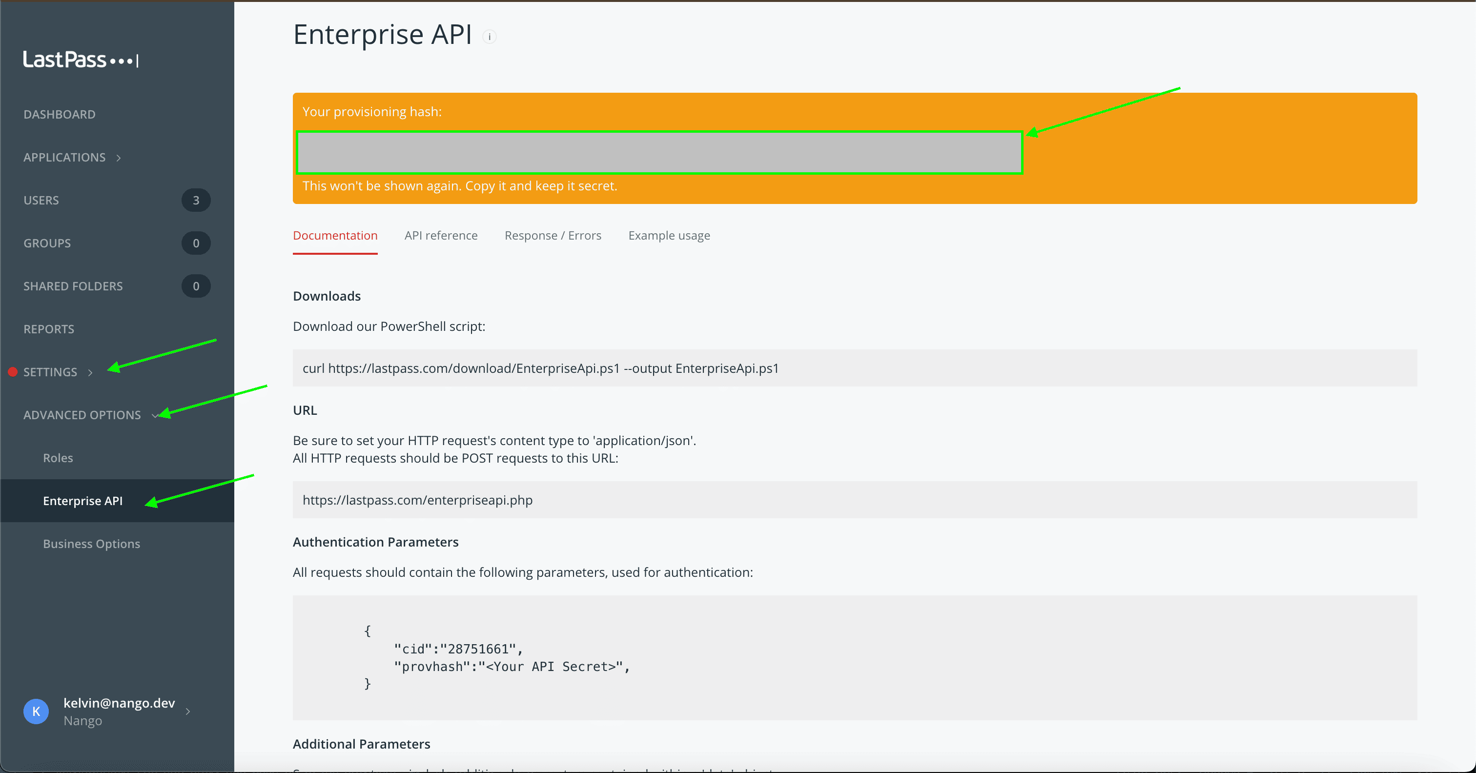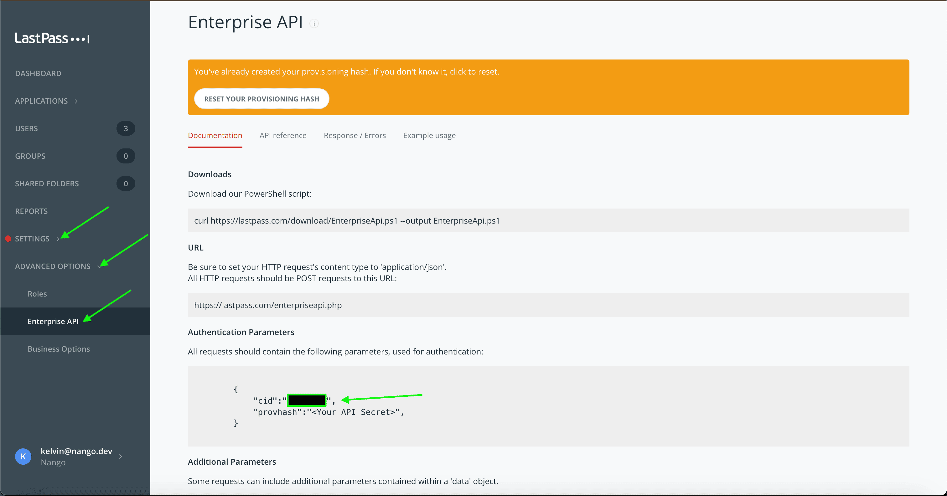 - Provhash - The API secret, also known as the provisioning hash, is referred to as Provhash. It is used alongside the CID to authenticate your API requests.