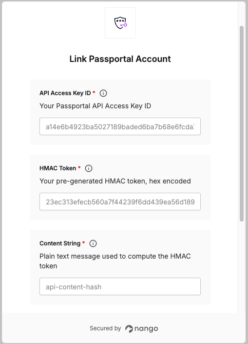 To authenticate with Passportal, you need:- API Access Key ID – Your Passportal API Access Key ID.
