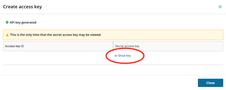 - View the Access key ID, then click Show key to reveal the Secret access key.