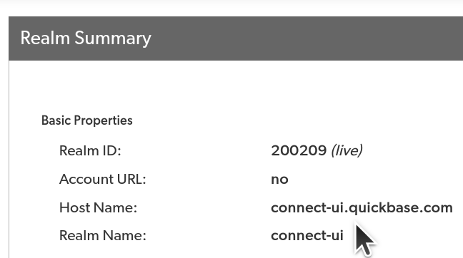 • Your Realm Hostname is your realm name + .quickbase.com