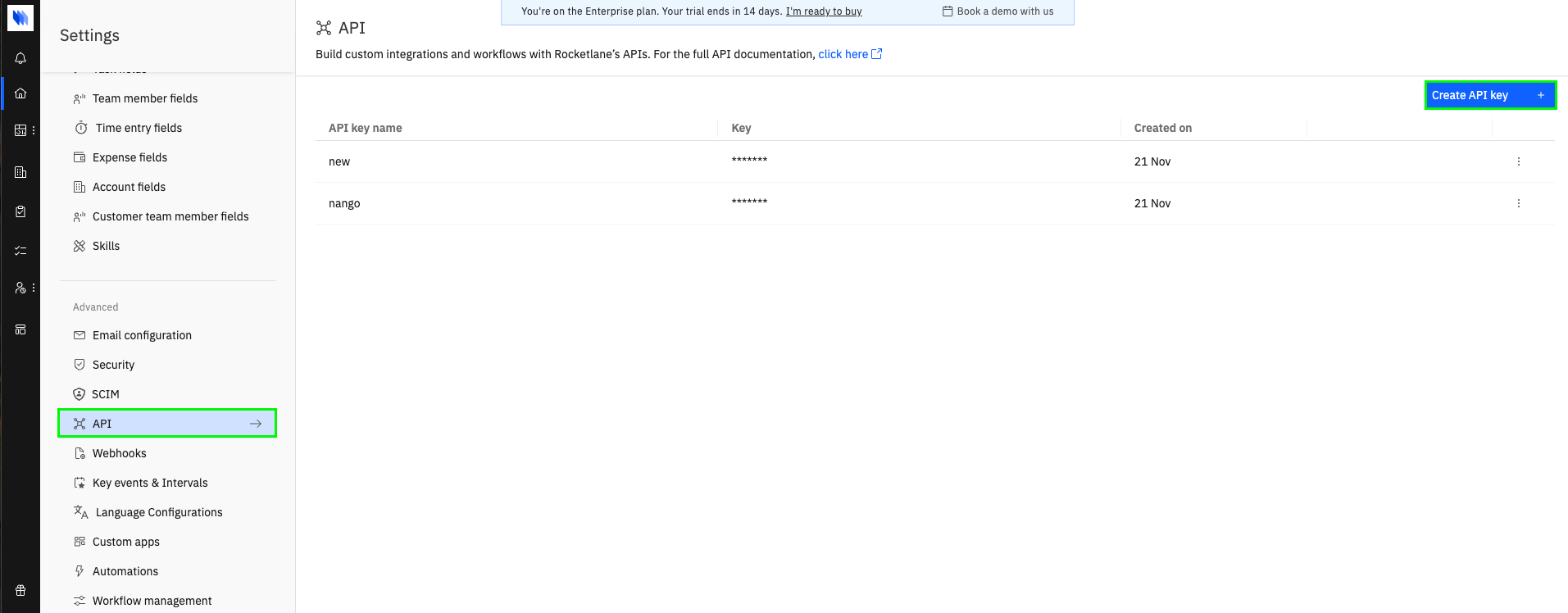 To authenticate with Rocketlane, you will need:- API Key — A key that grants Nango permission to interact with Rocketlane’s API resources and services.