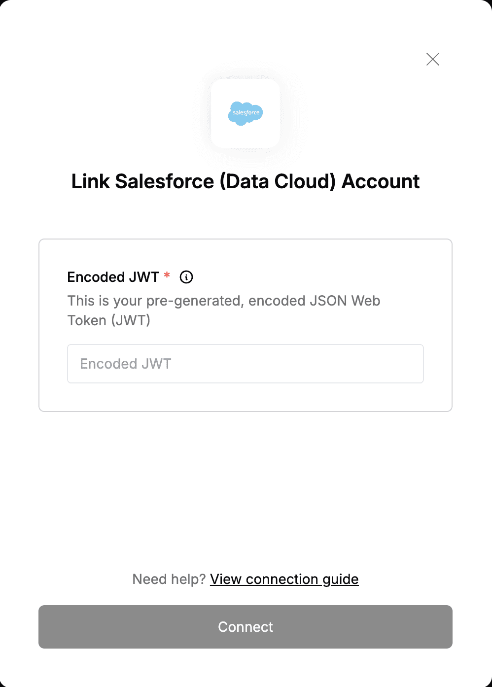 To authenticate with Salesforce (Data Cloud), you need:- Encoded JWT - A unique string that enables client applications to access Salesforce (Data Cloud) resources without requiring users to provide their credentials.