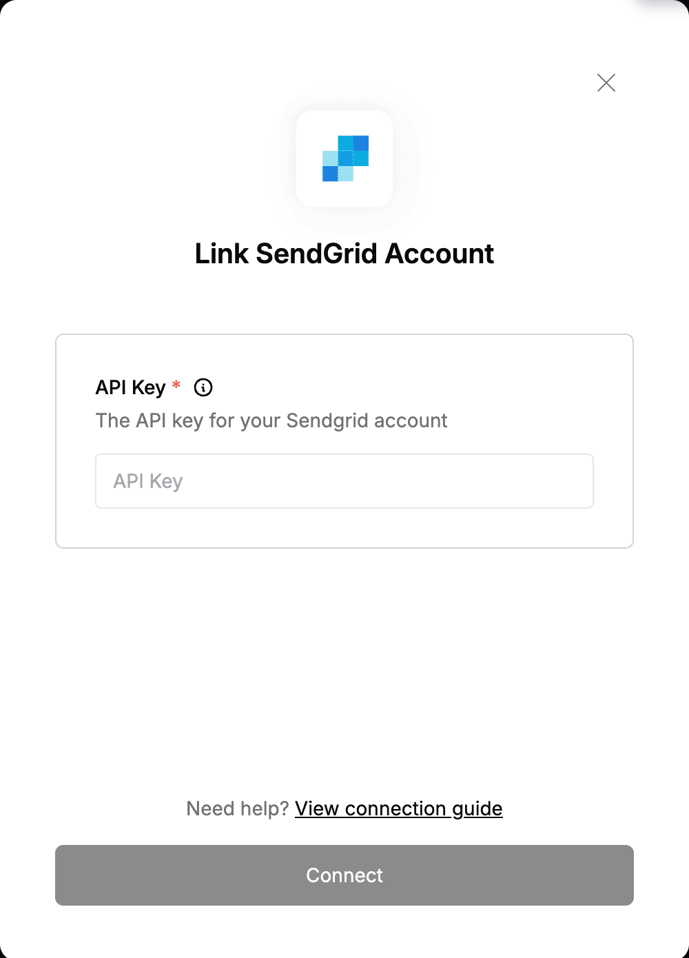To authenticate with SendGrid, you need:- API Key - Your SendGrid API Key.