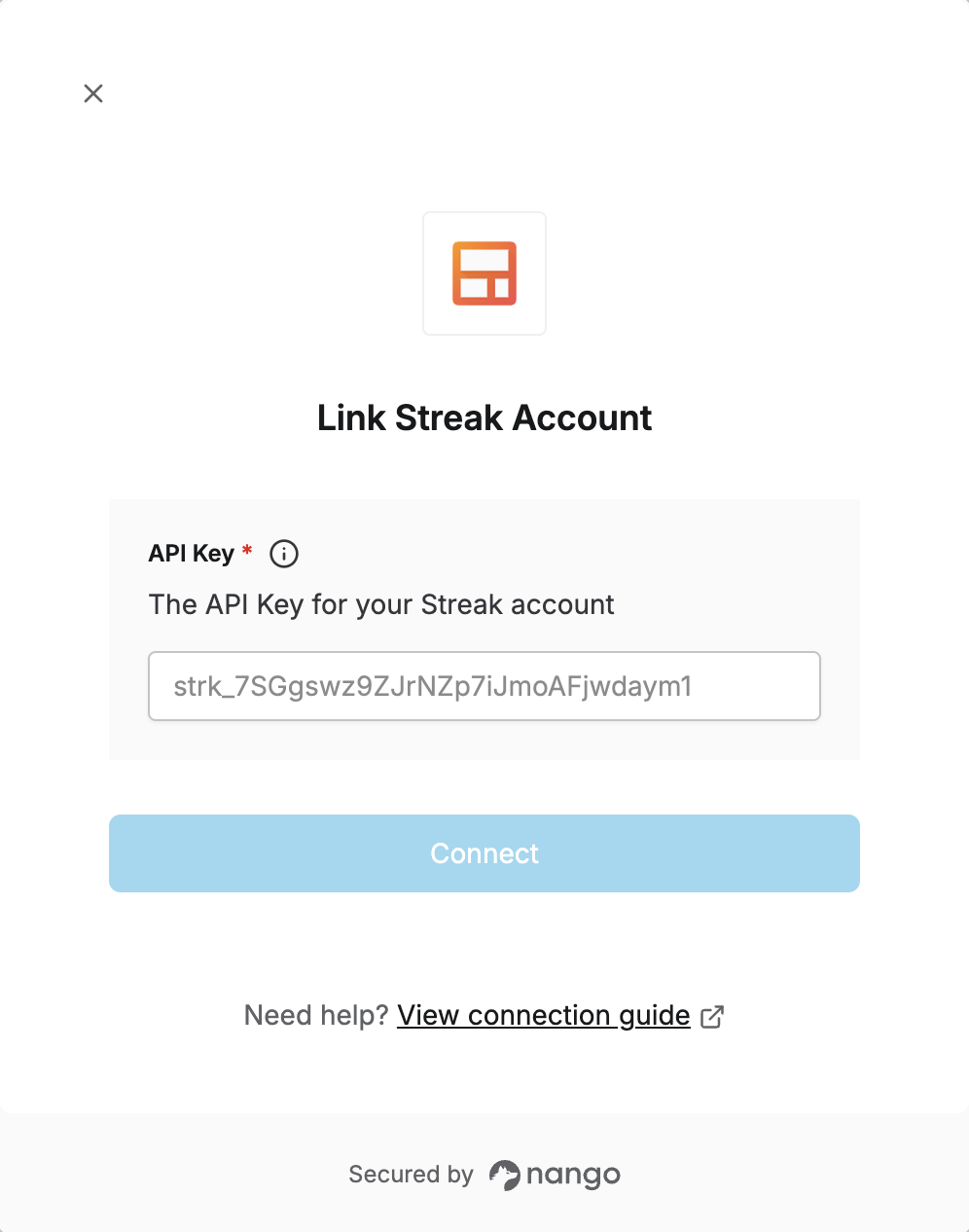 1. API Key - A key that grants Nango permission to interact with Streak’s API resources and services.