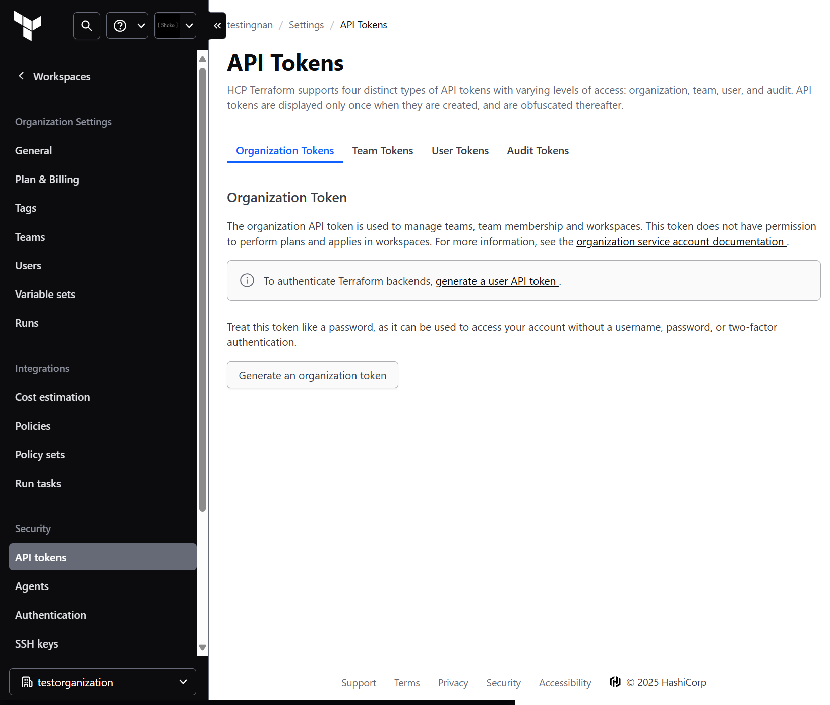4. Generate an API Token using the controls below the Organization Tokens header.